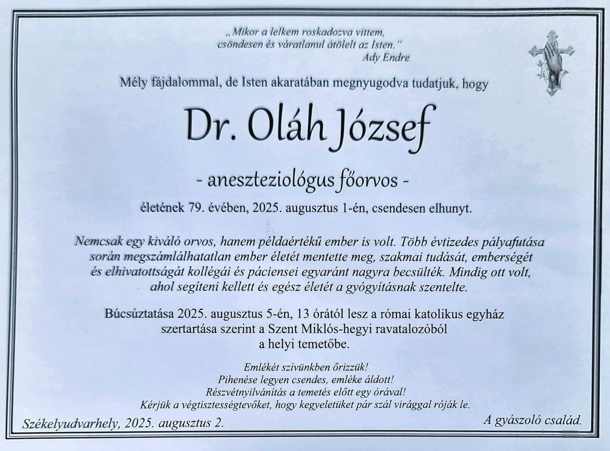 Türelemmel viselt hosszas betegség után 79. éves korában elhunyt dr. Oláh József, a székelyudvarhelyi Városi Kórház intenzív osztályának egykori osztályvezető aneszteziológus főorvosa.