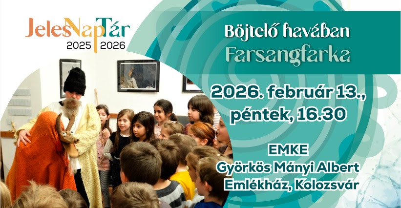 A JelesNapTár hagyományőrző gyermekprogram 2026. február 13-án, pénteken, 16.30 órától jelentkezik újra a Györkös Mányi Albert Emlékházban (Kolozsvár, Republicii/Majális u. 5.). Böjtelő havában a farsang farkához fűződő szokásokkal, hagyományokkal ismerkedhetnek meg az érdeklődők.